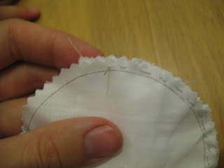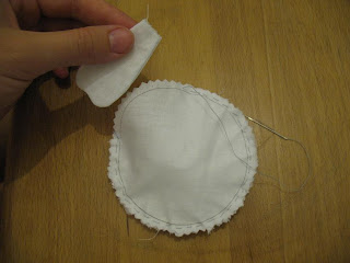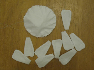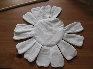 К сожалению фото раскроя у меня нет.. но там все просто, складываем ткань пополам (я использую плотную Гостовскую бязь), обводим 15 лепестков, лепестки сшиваем оставив место для выворачивания не зашитым (на выкройке оно обозначено пунктиром), обводим круг- нашу будущую сердцевину ромашки, скалываем посередине булавочкой чтоб нижняя ткань не съезжала и вырезаем (НЕ СШИВАЕМ!!!) оставив припуски 0,5 см. Я все вырезаю ножницами зигзаг, у кого их нет не забудьте сделать надрезы чтоб ткань не стягивалась после выворачивания.