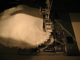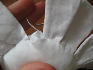 Берем иголочку с ниткой и начинаем наметывать, вкладываем лепестки между двумя кругами, ровняем краешки и прошиваем захватывая все 4 слоя ткани, лепестки укладываются внутри как веер, следите чтоб между лепестками (в месте сшивания) был отступ примерно1-2мм.